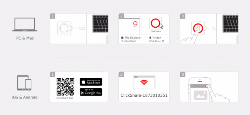 Pour partager votre écran aux utilisateurs dans la salle et à distance simultanément, une installation de logiciel doit être effectuée pour pouvoir partager des documents via ClickShare.