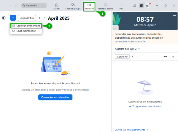 Une fois connecté à votre compte établissement sur Zoom logiciel, cliquez sur Réunions puis sur Créer un événement afin de créer une salle de réunion.